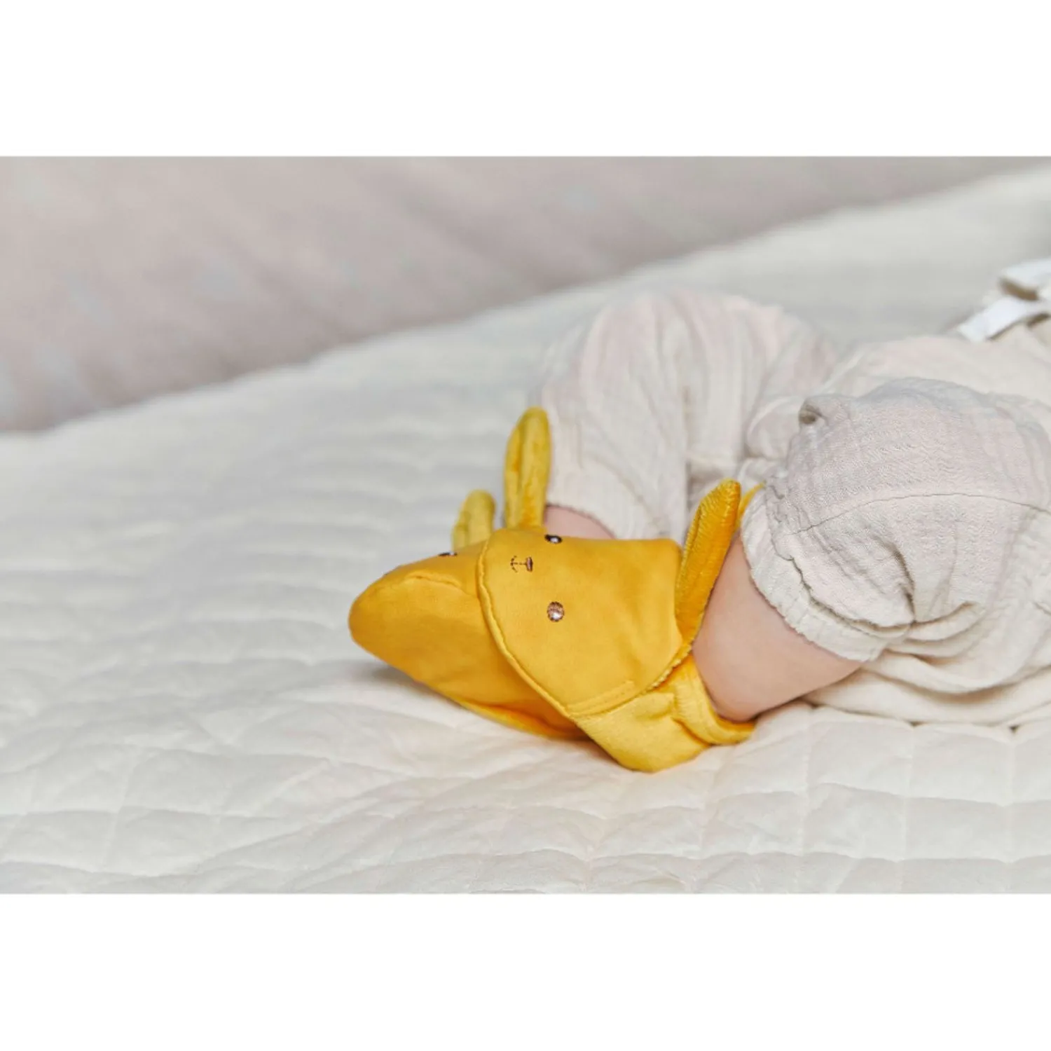 This Set Of 3 Essentials Is The Perfect Birth Gift For Babies. It Includes A Comforter, A Teether And Ochre Slippers. The Comforter Is A Cheerful Rabbit, Baby’S First Companion Throughout The Day And Night. Made From Twomaterials, Corduroy And A Light Viscose Fabric, It’S Perfectly Suited Tobaby’S Comfort. The 11,7 Inches Rabbit Comforter Features Long, Cuddlyears. Thanks To Them, You Can Hang It Up Anywhere And Never Lose It. Aswell As Wrapping Baby In Tender Hugs, They’Re Easy For Little Hands Tograb. The Silicone Teether Is Ideal For Relieving Teething Problems. Itssoft, Rounded Shape Makes It Ideal For Little Mouths, With A Height Of 2,73Inches And A Width Of 3,12 Inches. Designed With Baby’S Well-Being In Mind,It Has 2 Textures. The Front Is Smooth, While The Back Has Spikes To Helpthe First Teeth Come Through And Massage Sore Gums. The Large, Soft Earsare Easy For Baby To Grasp And Can Be Hung Anywhere Baby Goes. What’S More,The Ears Are Detachable For Easy Washing. The Slippers Can Be Used From 0 To 6 Months And Match Thecomforter And Teether To Keep Baby Warm. Made From Two Materials, Corduroyand Suede, They’Re Soft And Cute On Baby’S Feet, With Little Bunny Ears.This Set Comes In A Pretty Box That Can Be Personalised With A Message Inthe Space Under The Lid. Machine Wash At 30° For The Comforter And Teether.Hand Wash For The Slippers.