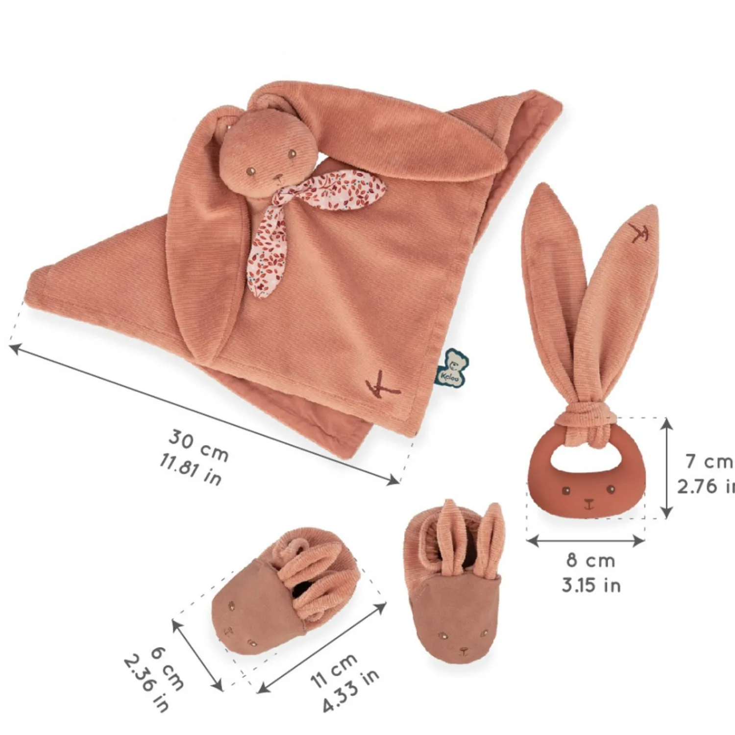 This Set Of 3 Essentials Is The Perfect Birth Gift For Babies. It Includes A Comforter, A Teether And Terracotta Slippers. The Comforter Is A Cheerful Rabbit, Baby’S First Companion Throughout The Day And Night. Made From Twomaterials, Corduroy And A Light Viscose Fabric, It’S Perfectly Suited Tobaby’S Comfort. The 11,7 Inches Rabbit Comforter Features Long, Cuddlyears. Thanks To Them, You Can Hang It Up Anywhere And Never Lose It. Aswell As Wrapping Baby In Tender Hugs, They’Re Easy For Little Hands Tograb. The Silicone Teether Is Ideal For Relieving Teething Problems. Itssoft, Rounded Shape Makes It Ideal For Little Mouths, With A Height Of 2,73Inches And A Width Of 3,12 Inches. Designed With Baby’S Well-Being In Mind,It Has 2 Textures. The Front Is Smooth, While The Back Has Spikes To Helpthe First Teeth Come Through And Massage Sore Gums. The Large, Soft Earsare Easy For Baby To Grasp And Can Be Hung Anywhere Baby Goes. What’S More,The Ears Are Detachable For Easy Washing. The Slippers Can Be Used From 0 To 6 Months And Match Thecomforter And Teether To Keep Baby Warm. Made From Two Materials, Corduroyand Suede, They’Re Soft And Cute On Baby’S Feet, With Little Bunny Ears.This Set Comes In A Pretty Box That Can Be Personalised With A Message Inthe Space Under The Lid. Machine Wash At 30° For The Comforter And Teether.Hand Wash For The Slippers.